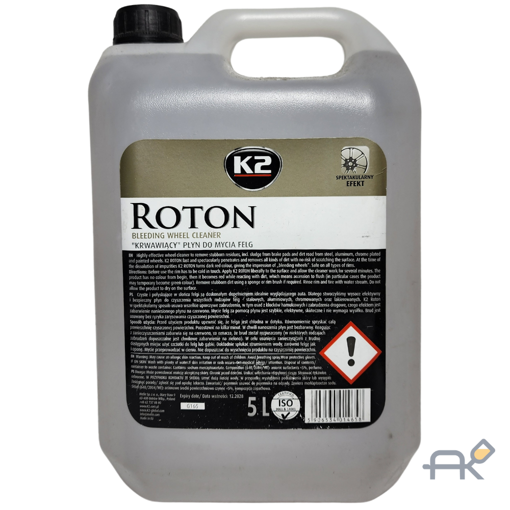 K2 ROTON эффективно проникает и удаляет любые стойкие загрязнения, в том числе шлам от тормозных колодок и дорожную грязь. Во время растворения загрязнений K2 ROTON приобретает темно-красный цвет, создавая впечатление "кровотечения колес", что означает, что можно смывать водой. Удаляет грязь без риска поцарапать поверхность. Безопасен для всех видов дисков и колпаков.