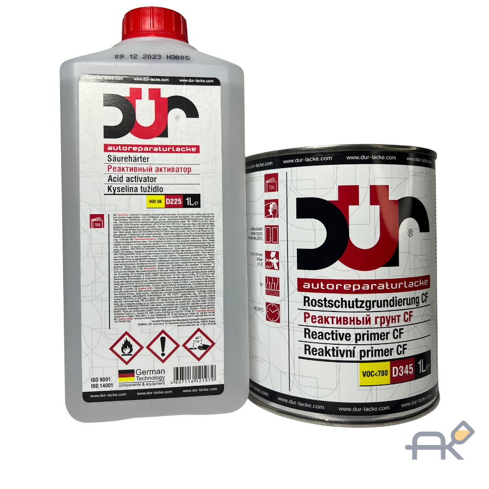 Быстросохнущий фосфатирующий антикоррозионный грунт DUR CF D345 обеспечивает надежную антикоррозионную защиту металла и отличную адгезию основного покрытия к поверхности. Не содержит хроматов. Для отверждения реактивного грунта CF применяется реактивный активатор D225. Пропорция смешивания: 1:1.