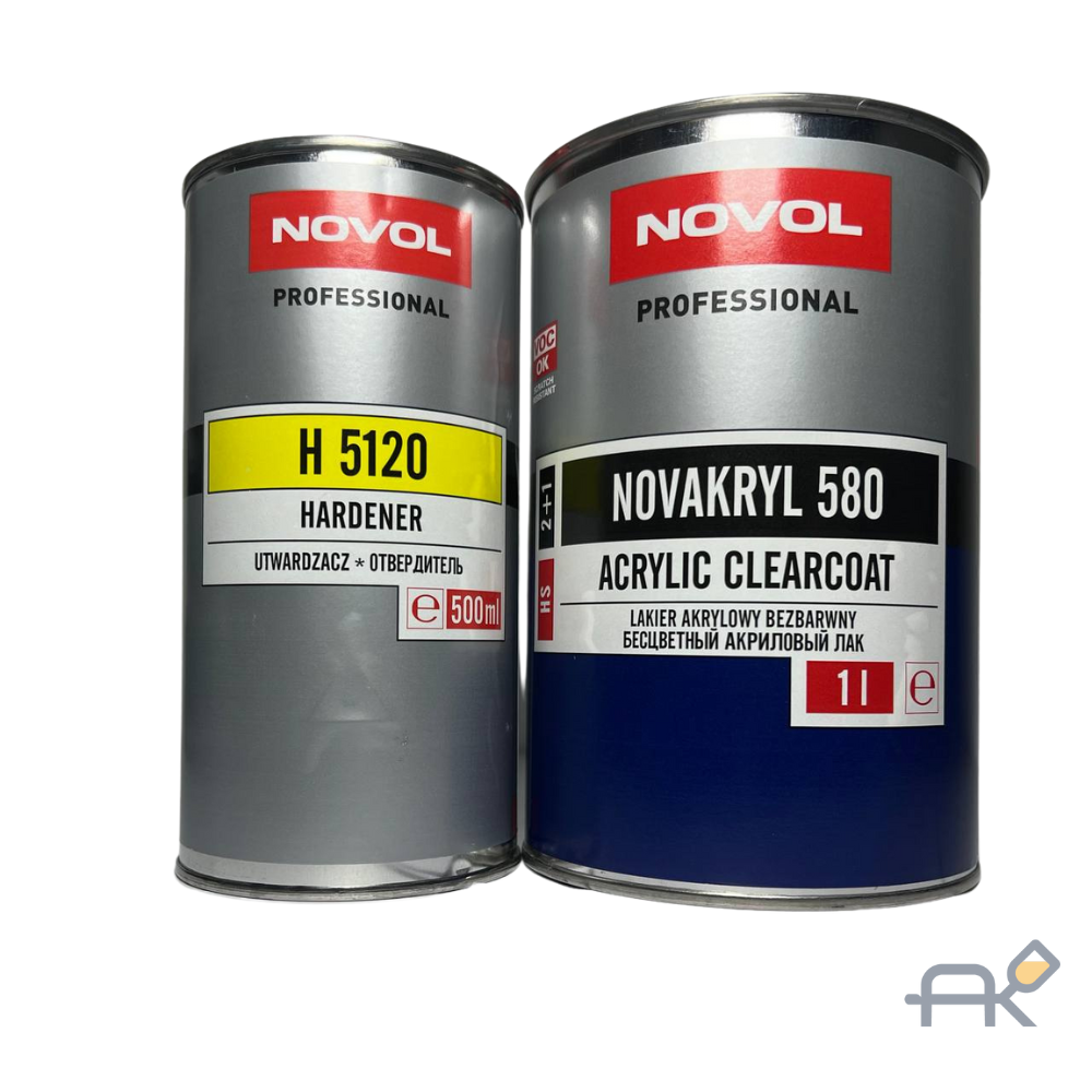 NOVOL NOVAKRYL 580 – это двухкомпонентный бесцветный акриловый лак с большим количеством твердых частиц и повышенной стойкостью к царапинам (SR - Scratch Resistant). Предназначен для создания финишного, защитно-декоративного покрытия поверх базовых эмалей (водных или сольвентных). Обеспечивает высокую прочность, отличный блеск, "глубину", хорошую растекаемость и быструю сушку, что делает его удобным для ремонтов и воспроизведения оригинального заводского покрытия. Устойчив к УФ-излучению и атмосферным условиям. Требует добавления отвердителя H 5120 и, опционально, разбавителя THIN 850.