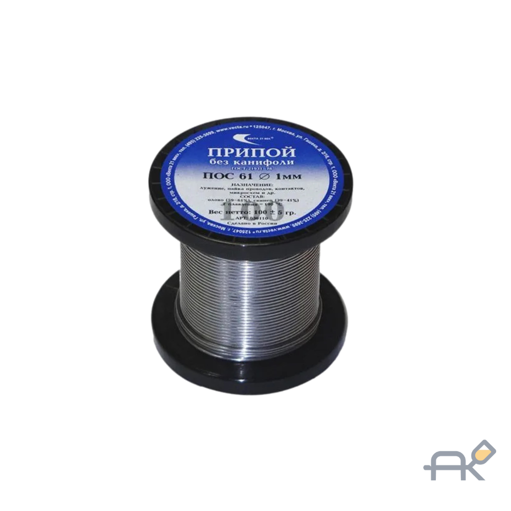 Припой оловянно-свинцовый. Содержание олова: 61% от общей массы. Без канифоли. Предназначен для пайки и лужения токоведущих частей из меди, латуни и бронзы с герметичным швом.