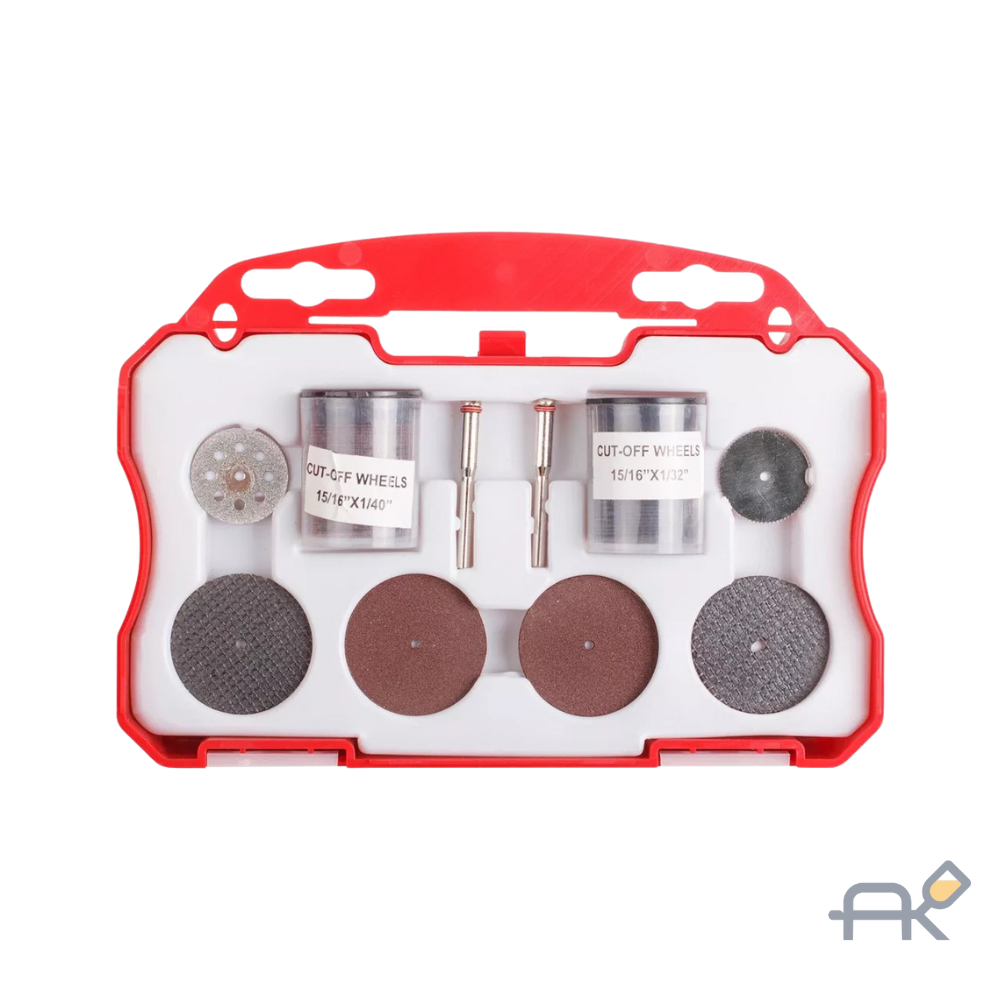 В набор входит: 1шт Алмазный диск: 22x0.6mm; 1шт Пильный диск: 22x0.3mm; 2шт Отрезной диск армированный стекловолокном:32x1.2мм; 2шт Отрезной диск:32x1.6мм; 2шт Держатель для отрезного диска: 3.2мм; 36шт Отрезной диск обычный: 24x0.6мм; 30шт Отрезной диск для тяжелых работ: 24x0.8мм.