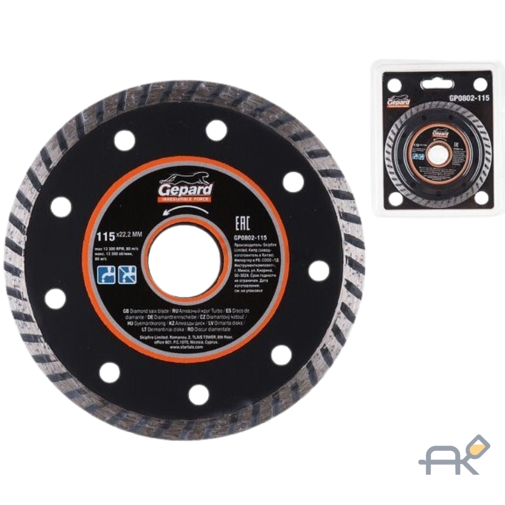 - Тип кромки "Turbo": Сплошная режущая кромка с косой насечкой по боковым сторонам обеспечивает ровный, аккуратный и быстрый рез. Насечка также увеличивает механическую прочность диска и улучшает отвод тепла во время работы.