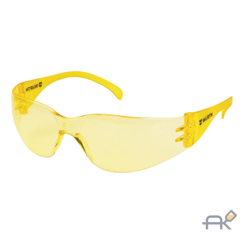 Защитные очки WURTH Standard открытого типа с желтой линзой (артикул 0899103122). Предназначены для надежной защиты глаз от летящих частиц и других механических воздействий (удары низкой энергии). Обеспечивают ударопрочность и высокую степень защиты от ультрафиолетового излучения (до 99%).