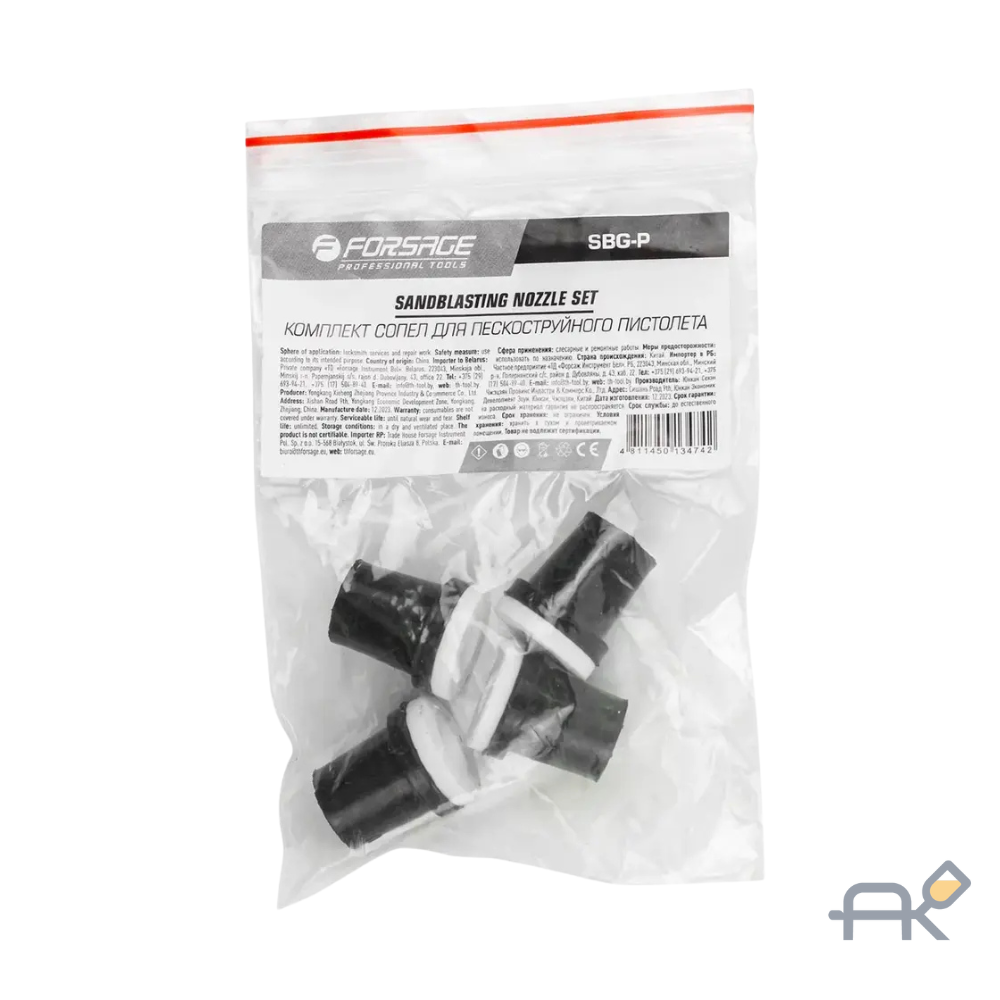 Комплект сопел для пескоструйного пистолета от бренда Forsage включает размеры выходного отверстия: 2 мм, 2.5 мм, 3 мм и 3.5 мм. Сопла для пескоструйных пистолетов используются для создания струи абразивного материала, которая удаляет ржавчину, краску, лак и другие загрязнения с поверхности металла.
