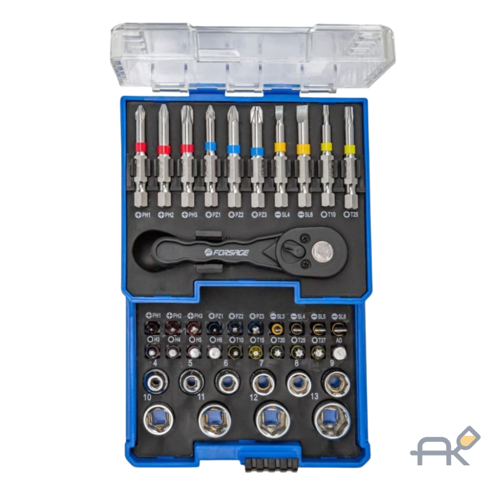 Набор инструментов 41 пр. Forsage F-2411-5 - предназначен для широкого спектра применений, особенно в механике, строительстве и ремонтных работах. Биты разных типов (PH, PZ, SL, H, T) позволяют работать с различными видами винтов и крепежных элементов.