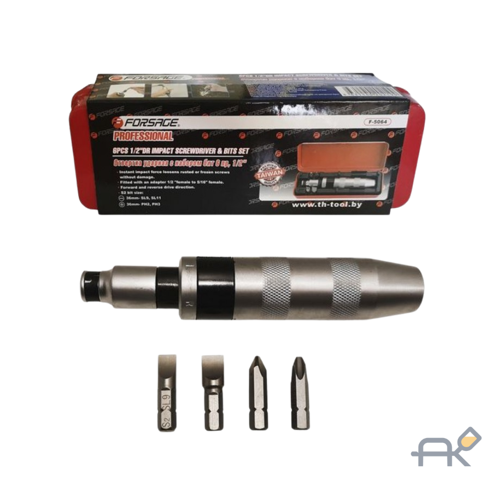 Ударная отвертка с защитной рукояткой и набором бит - это удобный инструмент для работы с крепежными изделиями. Она позволяет быстро и легко завинчивать и отвинчивать болты и гайки, даже если они заржавели или имеют сложную форму.