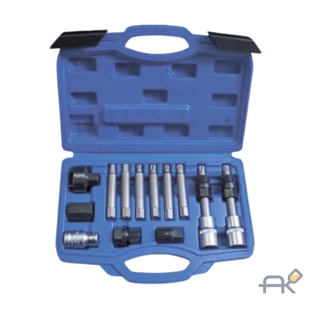 Набор для снятия шкивов генераторов относится к специализированному инструменту для ремонта автомобилей. Комплект включает в себя биты и вспомогательный инструмент для их удержания.
